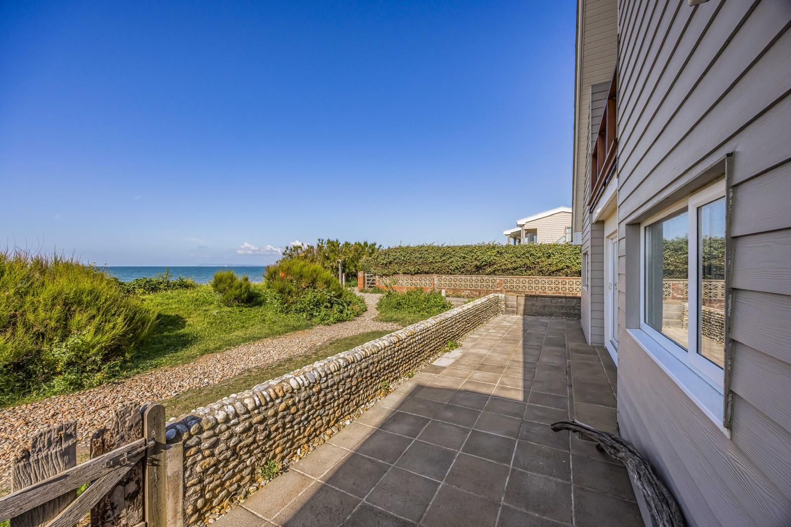 A tiled patio beside a light-colored house overlooks a gravel path, green shrubs, and the sea under a clear blue sky. Perfect to relax or Prepare For Goodwood Festival of Speed, with a stone wall separating the patio from the landscape.